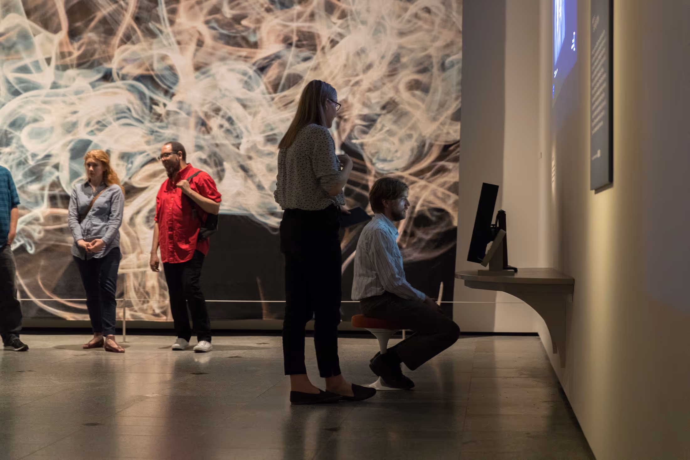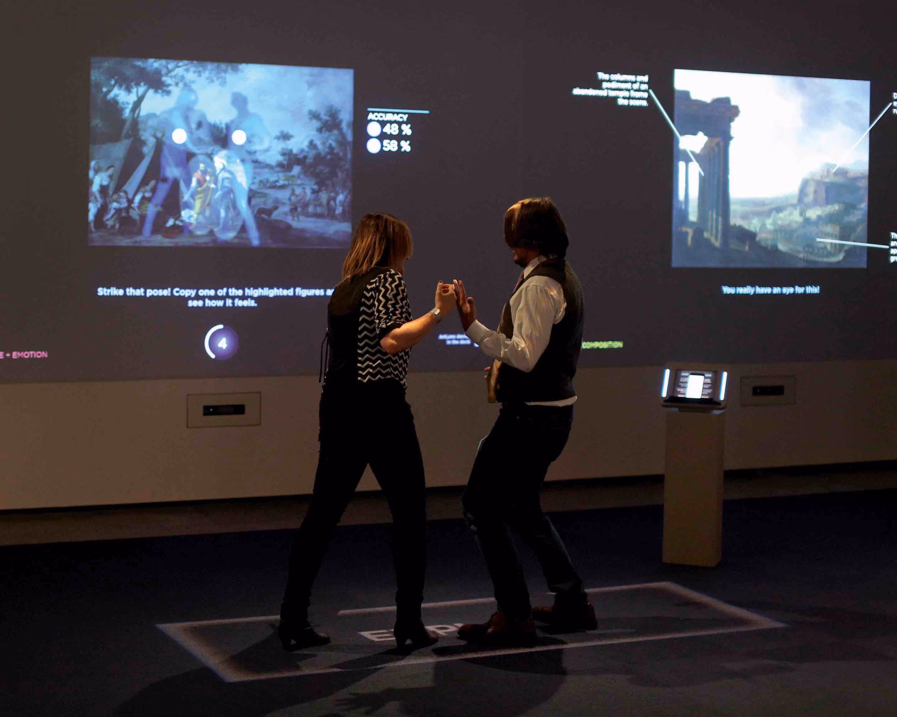 Visitors step into an immersive projection environment where artworks respond in real time—scaling up to reveal hidden details or shrinking down to reframe perspective. Full-body gesture, facial recognition, and even gaze tracking turn natural human movement into interaction. Guests can point, mimic, and react, and the exhibition responds—making moments that feel more like play than instruction.