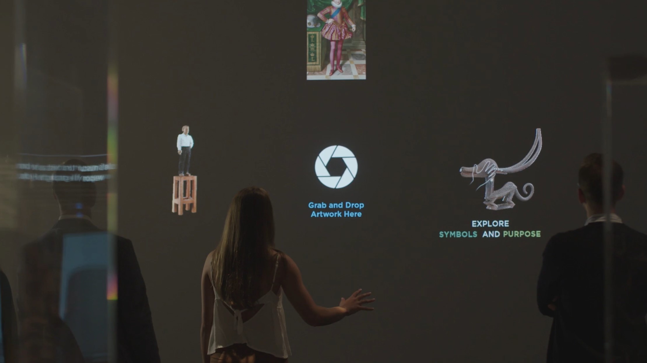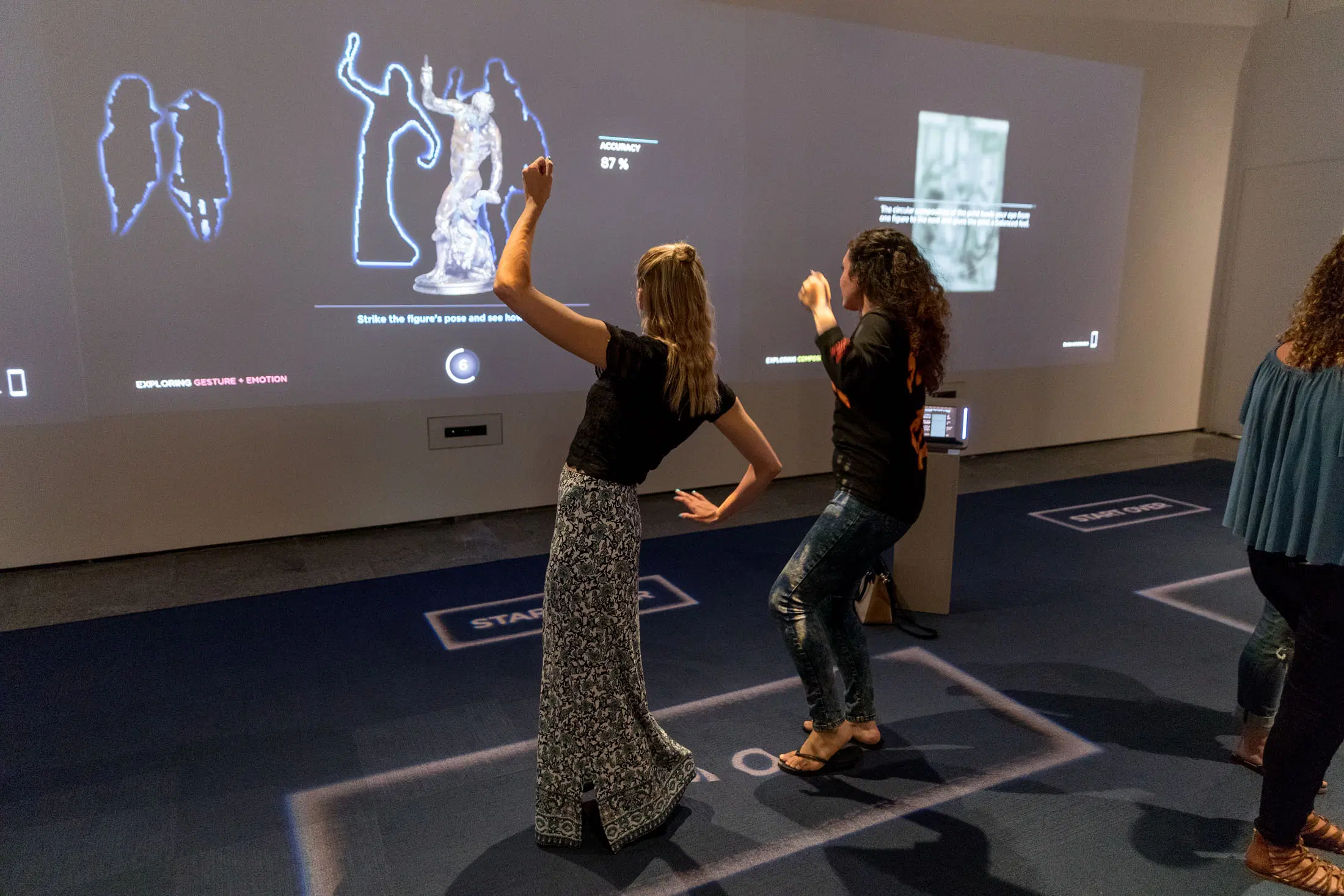 Visitors step into an immersive projection environment where artworks respond in real time—scaling up to reveal hidden details or shrinking down to reframe perspective. Full-body gesture, facial recognition, and even gaze tracking turn natural human movement into interaction. Guests can point, mimic, and react, and the exhibition responds—making moments that feel more like play than instruction.